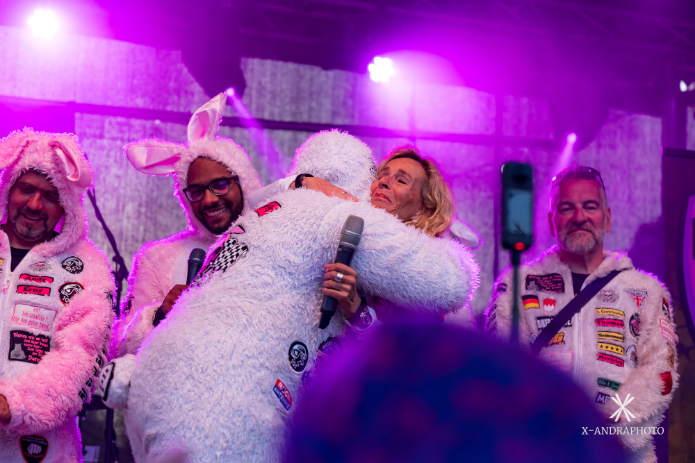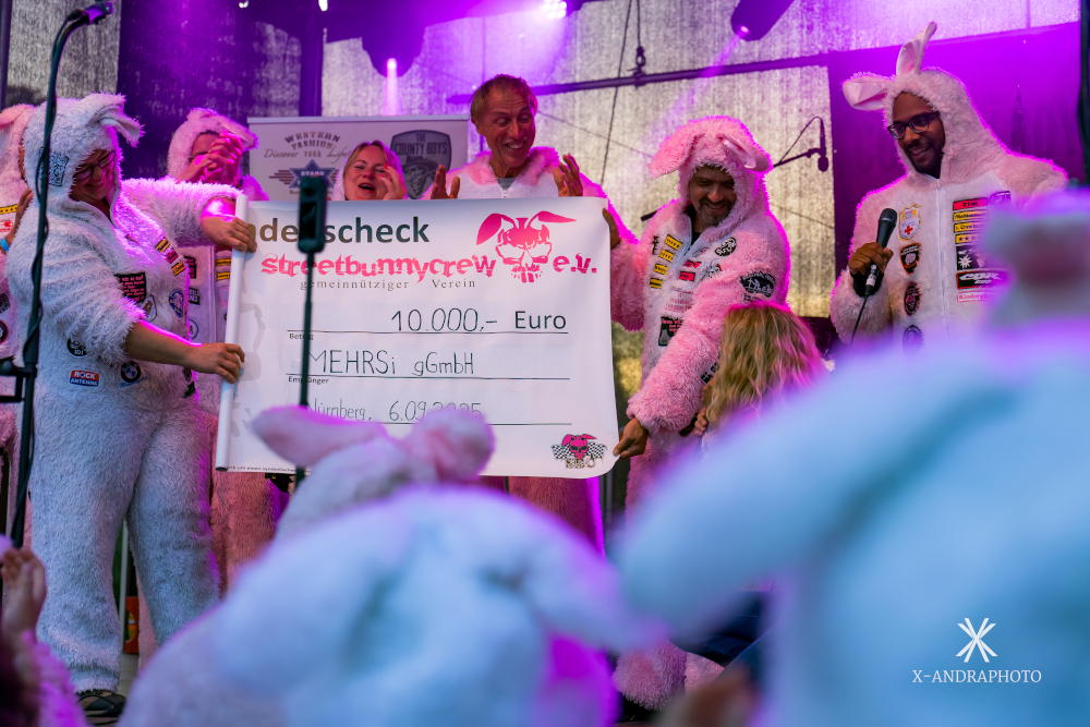 Liebe Streetbunnies, da habt ihr mich gleichzeitig ganz schön gefoppt und mir einen echten „Herzens-Schlag“ versetzt. Ich, nichtsahnend am MEHRSi-Stand „im Dienst“. Plötzlich taucht Jo Bauer mit Riesengetöse auf der Louis-Kawa auf und „befiehlt“ mir „Mitkommen, zur Bühne!“ Weil das Bodywork der Kawa aber nur aus hauchdünnem Alu besteht, war nix mit einfach hinten drauf setzen. Ich also wie ein Klammeräffchen um Jo geschlungen, um das Alu nicht zu demolieren. Und auch noch entgegen der Fahrtrichtung über dem Tank schwebend. Jo donnerte mit mir „artgerecht“ zur Bühne und warf mich praktisch auf die selbige. Ich wusste immer noch von nix, sah erstmal nur lauter Bunnies. Was dann kam, haute mich um. Wer mich kennt, der weiß, dass es eigentlich unmöglich ist, mich sprachlos zu machen. Ich war nicht nur das, ich musste auch das „Pippi in den Augen“ bestmöglich verbergen. 10.000.- Euro für MEHRSi – völlig irre! Damit können wir eine gehörige Portion von lebensgefährlichen Kurven entschärfen – und letztendlich Leben retten. Ihr seid großartig! Danke, danke, danke! Eure Monika